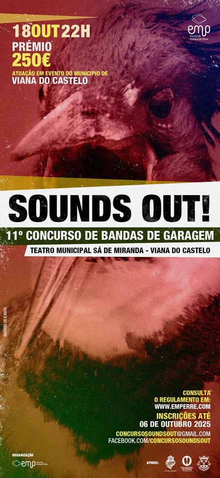 Concurso Sounds Out 2025 Estão abertas as inscrições para a 11ª edição do Concurso de Bandas de Garagem “SOUNDS OUT” a realizar no dia 18 outubro. Inscrições abertas até dia 6 de outubro Regulamento: Aqui Ficha inscrição: Aqui